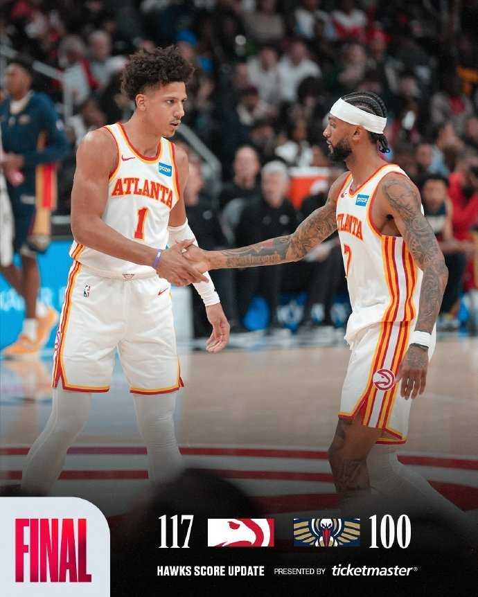 在连续输给猛龙两场,遭遇两连败之后,老鹰今天在客场以117-100战胜鹈鹕,终结了连败,也送给鹈鹕9连败。老鹰战绩来到18胜21负,暂时排在东部第九。鹈鹕本赛季已经是第2次遭遇9连败,战绩仅8胜31负,依旧排在西部倒数第一,全联盟仅比步行者战绩更好。